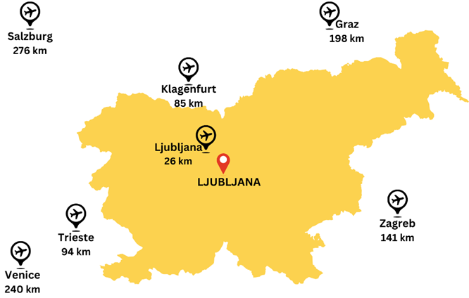 Ljubljana has an international airport Jože Pučnik, located 26 km northwest of the capital Ljubljana. Other convenient airports are Trieste-Ronchi (Italy), 94 km from Ljubljana, Venice international airport (Italy), 240 km from Ljubljana, Klagenfurt (Austria), 85 km from Ljubljana, Zagreb airport (Croatia), 141 km from Ljubljana.